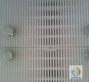 防止滤料在反冲洗时进入排水槽而流失。拦截板的材质为PE,尺寸规格为497mm×330mm,δ=24mm。安装时与拦截板支撑系统通过不锈钢螺栓连接,安装严密,块与块之间互相啮合,与池壁之间的间隙应密封,并有足够的刚性,保证在反冲洗时不会产生2mm以上的间隙。